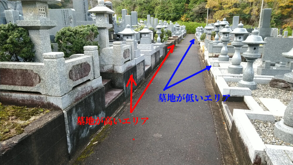 高いエリアはこの通路と墓地区画を仕切っているコンクリートの壁が50年くらい経過しているので、かなり劣化しており、新しい墓地を建てる場合は基本的に新しくコンクリート工事が必要になってきます。