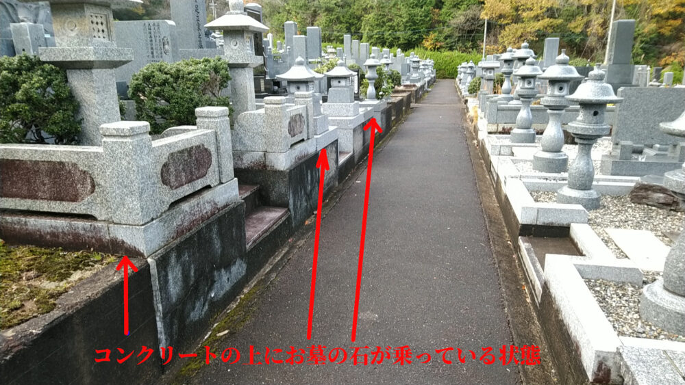 このように、古いコンクリートの上にお墓の石が乗る状態になるので、そのまま建ててしまうと、古いコンクリートの上に、新しい石が乗ることになり、明らかに施工不良の原因となります。